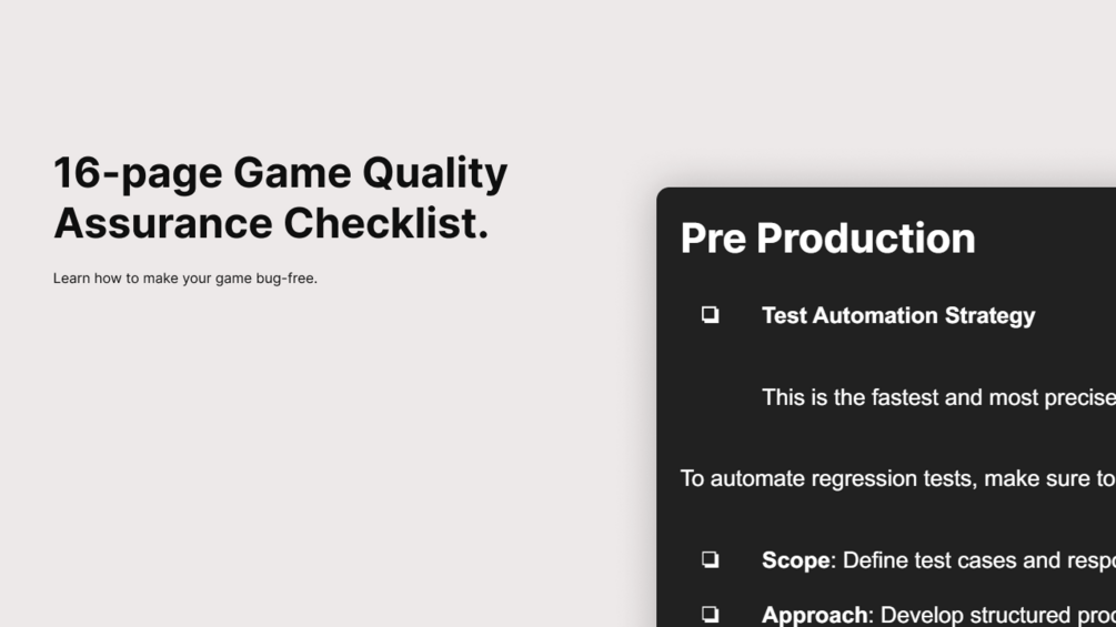 This comprehensive Game QA and Testing Checklist will help you to supercharge your game's quality 🦺 and eliminate your game's bugs 🪳 whether you are building with Unity, Unreal, or Godot.